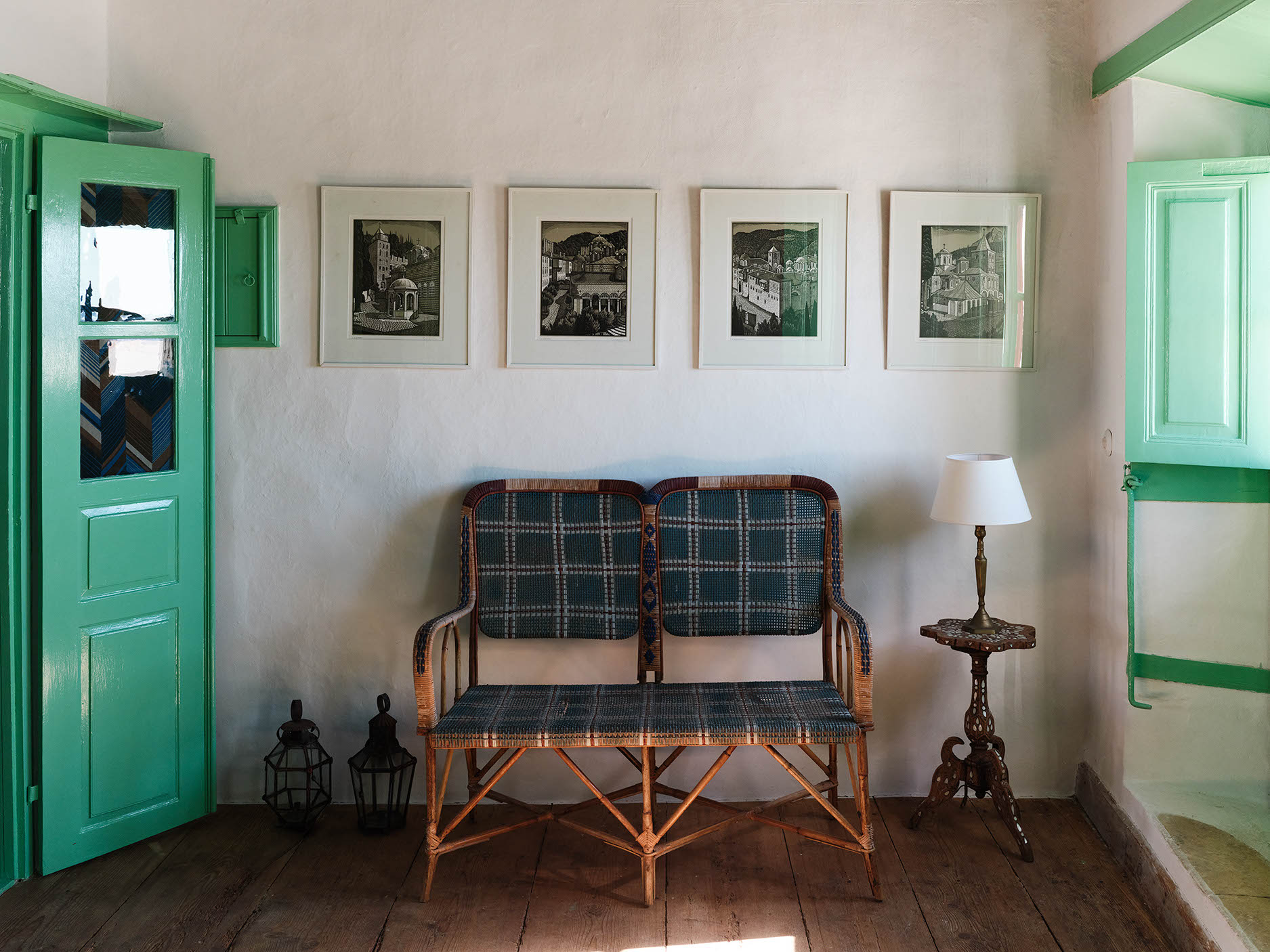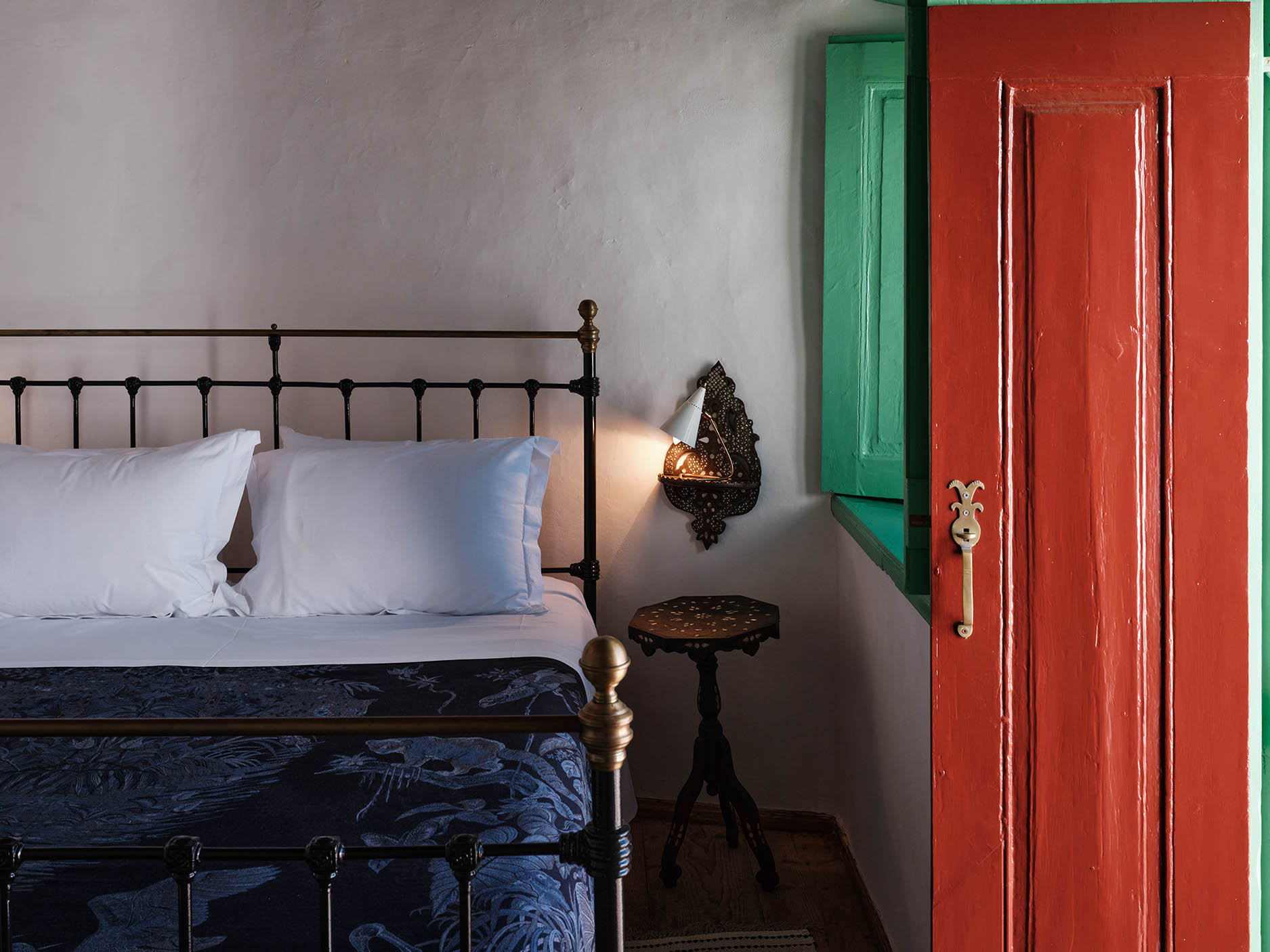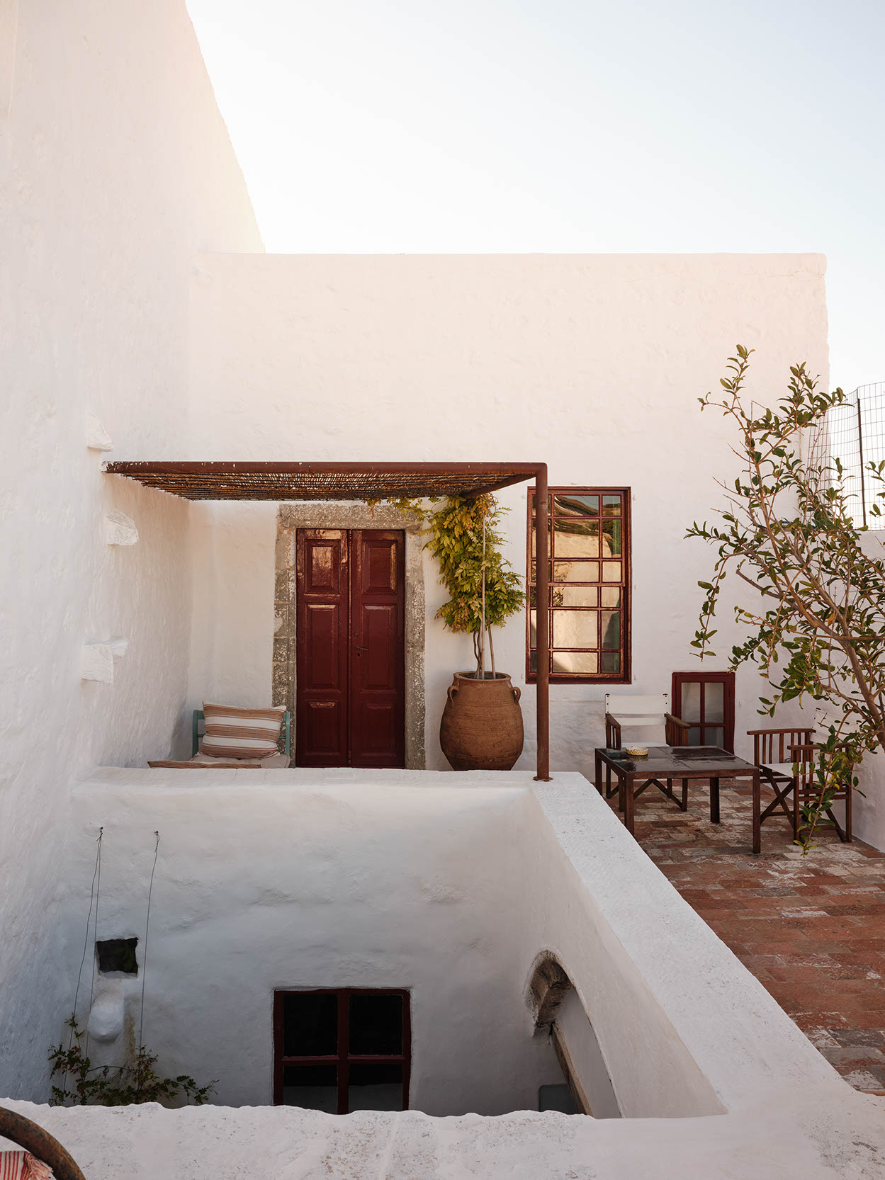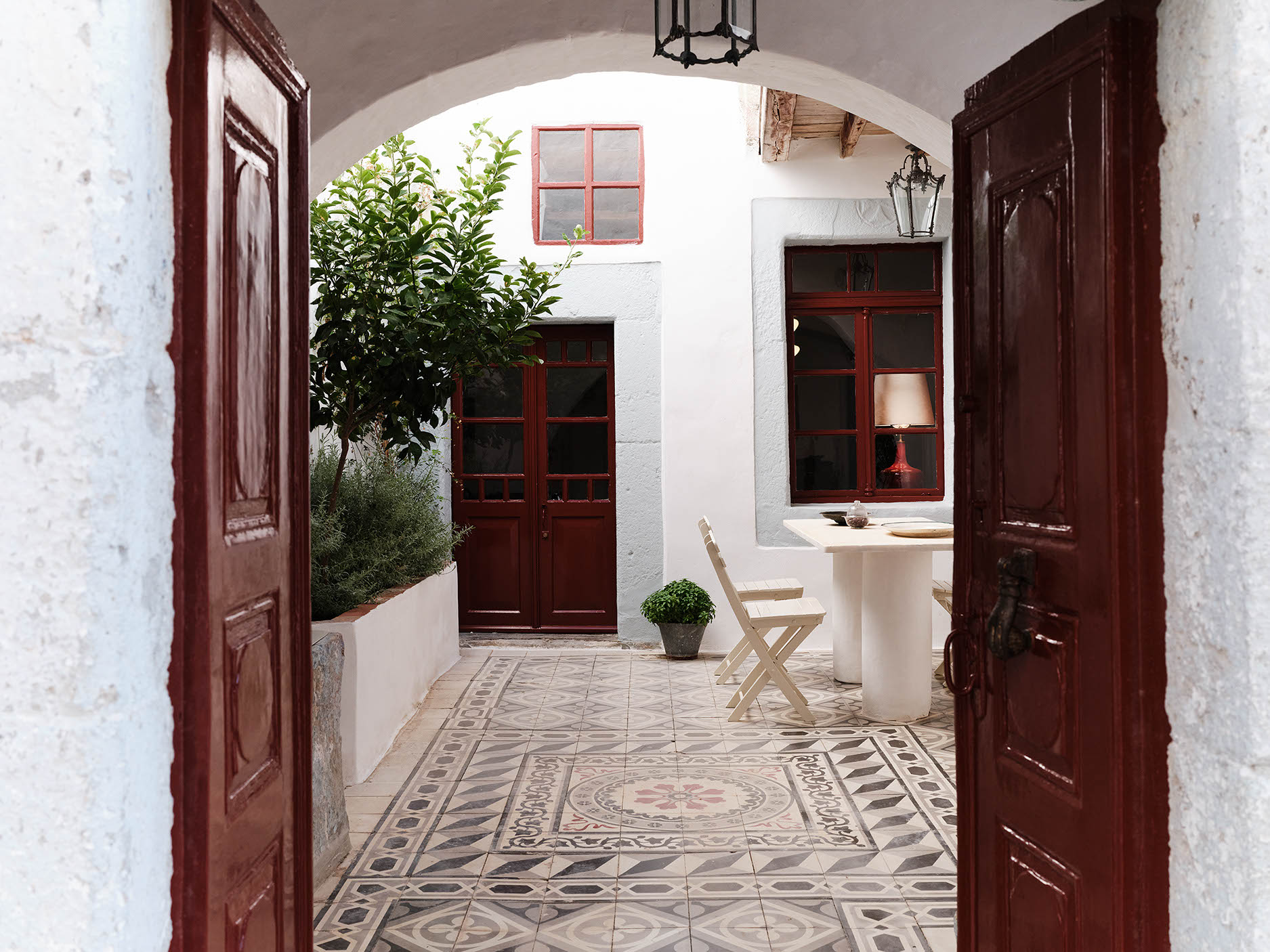 The layout includes one master bedroom with ensuite and dressing area, plus two double bedrooms with separate bathrooms. Traditional craftsmanship was preserved, while bespoke design, lighting, and bold colors introduce a contemporary twist. Aged marble and antique window shutters serve as tables and cabinets. The original wooden floors and cement tiles complement reclaimed cotto tiles and marble sinks. Vintage Greek and French textiles, and a curation of antique pieces enrich the interiors with subtle color and texture.