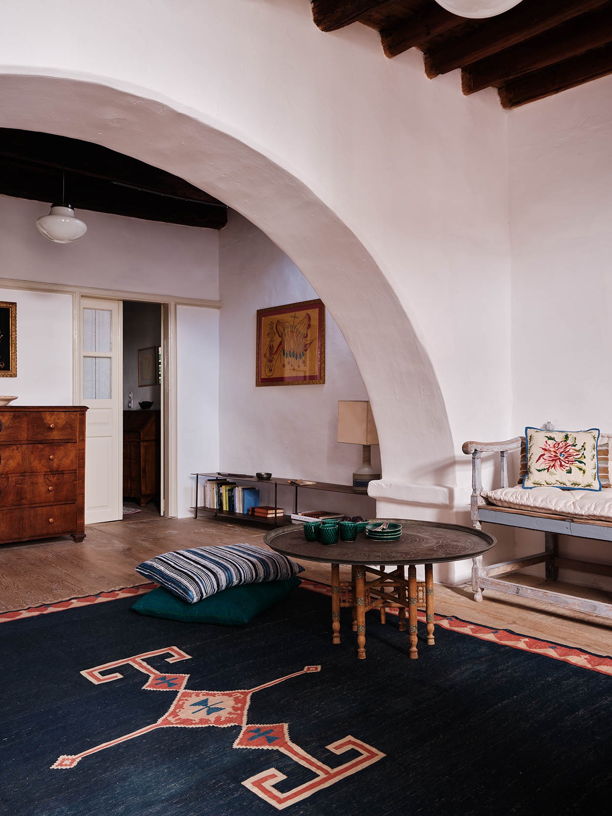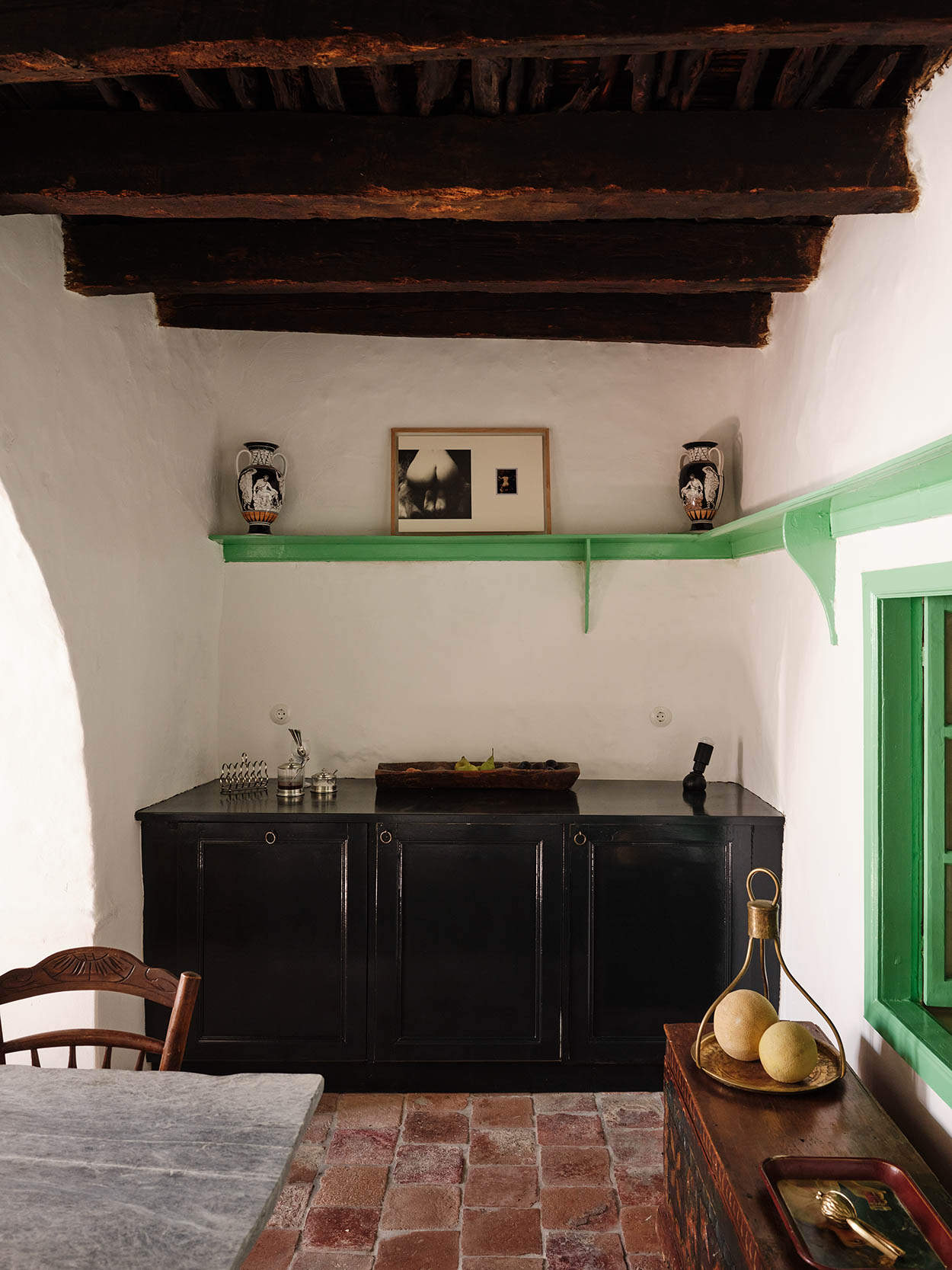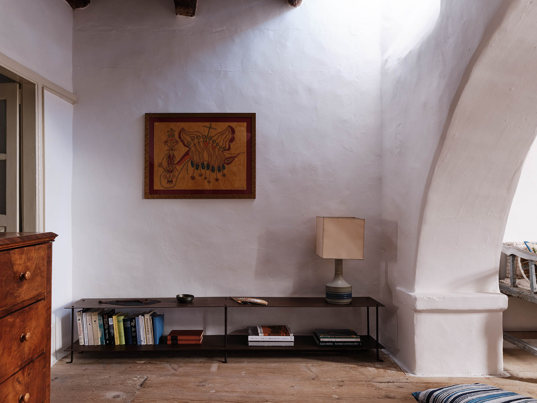 The layout includes one master bedroom with ensuite and dressing area, plus two double bedrooms with separate bathrooms. Traditional craftsmanship was preserved, while bespoke design, lighting, and bold colors introduce a contemporary twist. Aged marble and antique window shutters serve as tables and cabinets. The original wooden floors and cement tiles complement reclaimed cotto tiles and marble sinks. Vintage Greek and French textiles, and a curation of antique pieces enrich the interiors with subtle color and texture.