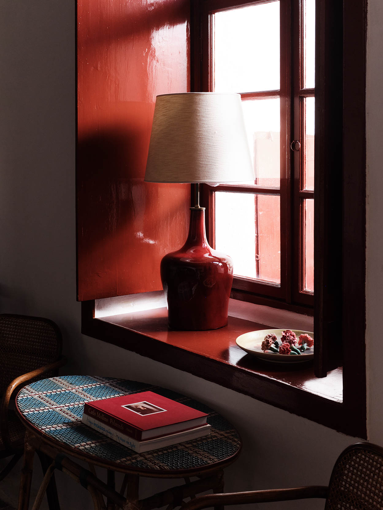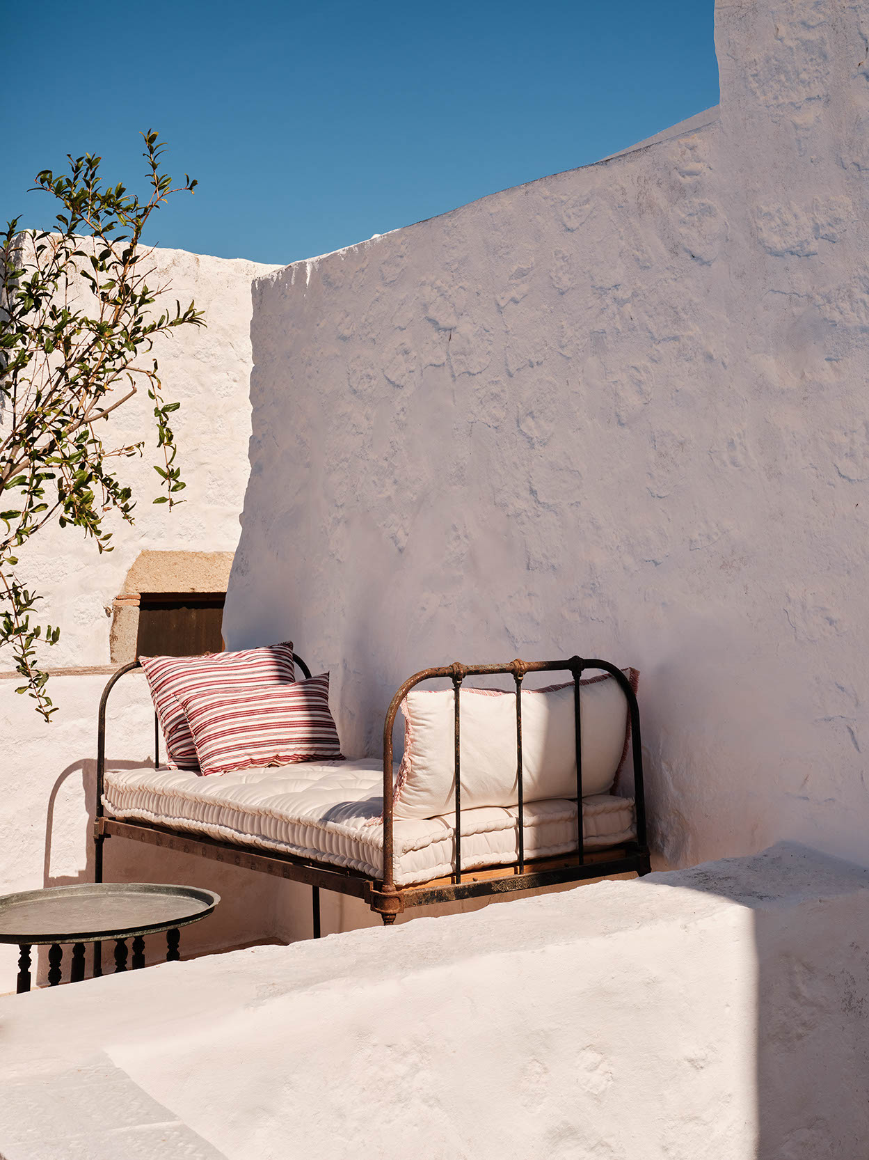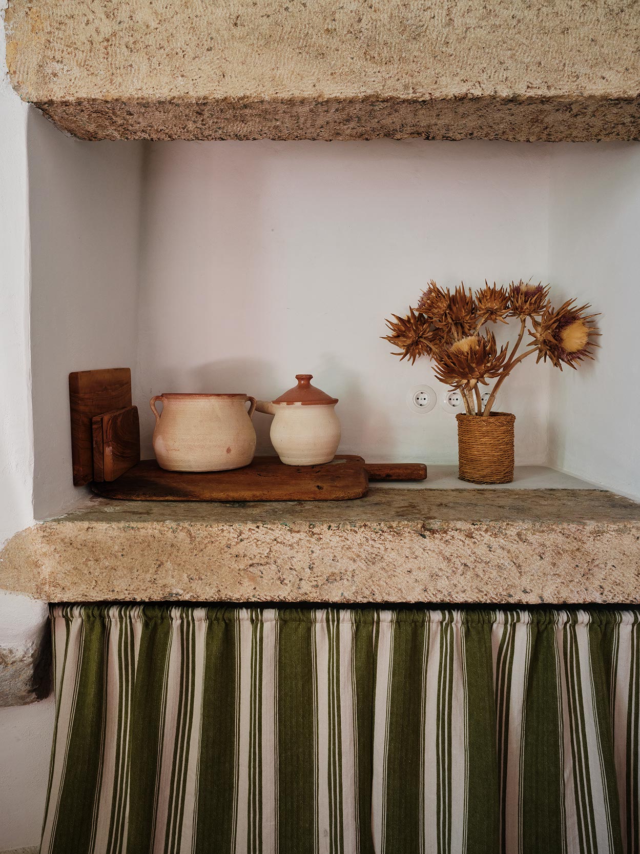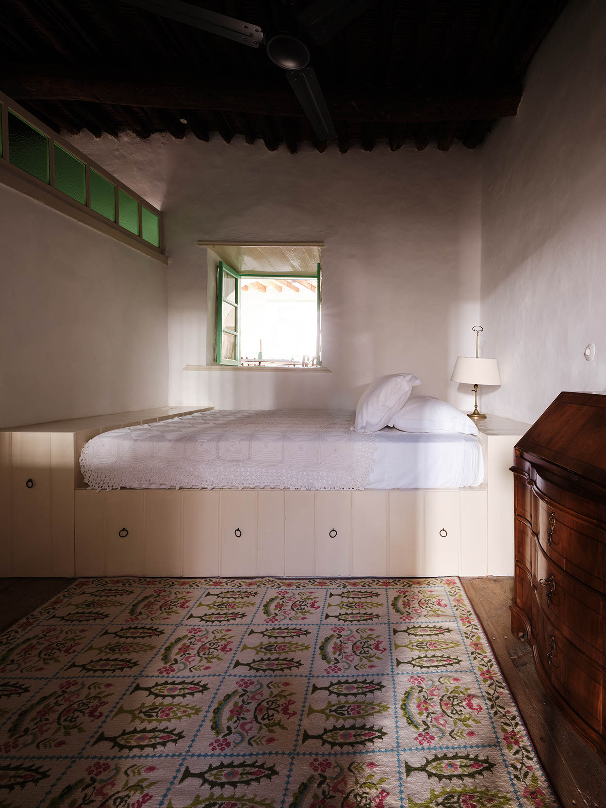 The layout includes one master bedroom with ensuite and dressing area, plus two double bedrooms with separate bathrooms. Traditional craftsmanship was preserved, while bespoke design, lighting, and bold colors introduce a contemporary twist. Aged marble and antique window shutters serve as tables and cabinets. The original wooden floors and cement tiles complement reclaimed cotto tiles and marble sinks. Vintage Greek and French textiles, and a curation of antique pieces enrich the interiors with subtle color and texture.